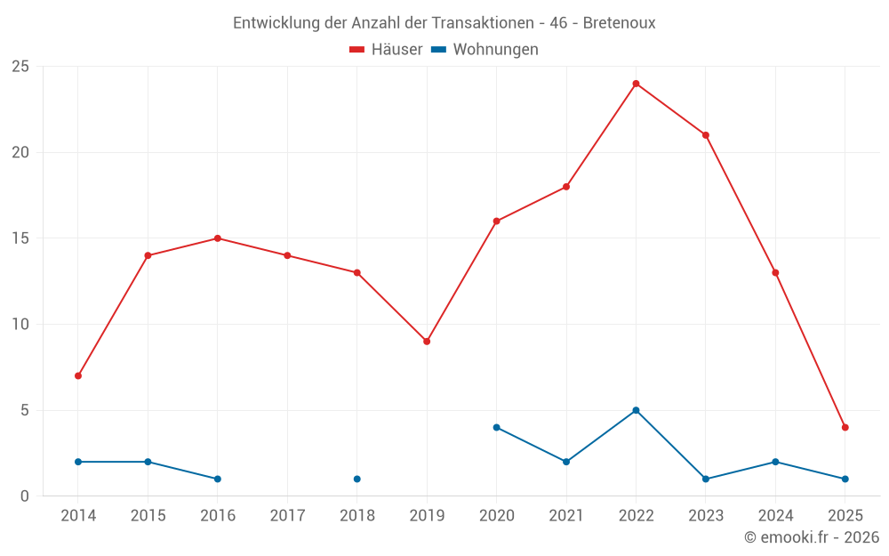 Der Durchschnittspreis auf den 33 Hausgeschäften der letzten 24 Monate in der Gemeinde Bretenoux betrug 1 441 € pro Quadratmeter für einen mittleren Immobilienwert von 130 000 €. Über diesen Zeitraum hinweg lagen 60% der Transaktionen zwischen 829 und 2 024 € pro Quadratmeter (vom 2. bis zum 8. Dezil).