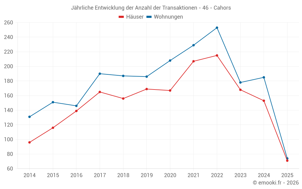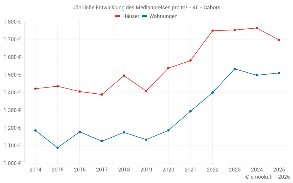 Der Durchschnittspreis auf den 34 Hausgeschäften der letzten 3 Monate in der Gemeinde Cahors betrug 1 651 € pro Quadratmeter für einen mittleren Immobilienwert von 149 425 €. Über diesen Zeitraum hinweg lagen 60% der Transaktionen zwischen 1 309 und 2 358 € pro Quadratmeter (vom 2. bis zum 8. Dezil).