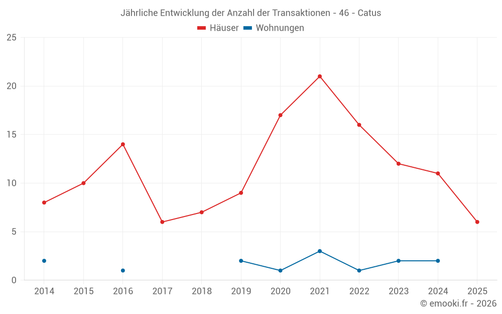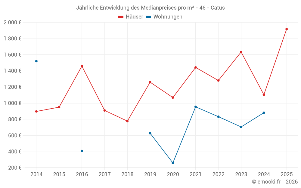 Der Durchschnittspreis auf den 23 Hausgeschäften der letzten 24 Monate in der Gemeinde Catus betrug 1 446 € pro Quadratmeter für einen mittleren Immobilienwert von 135 500 €. Über diesen Zeitraum hinweg lagen 60% der Transaktionen zwischen 1 009 und 2 149 € pro Quadratmeter (vom 2. bis zum 8. Dezil).