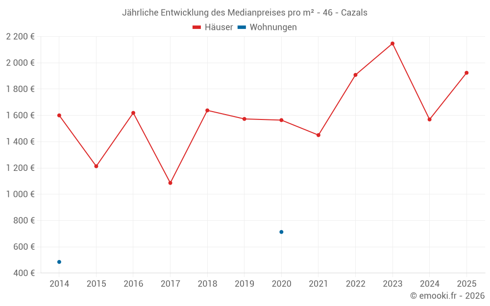 Der Durchschnittspreis auf den 19 Hausgeschäften der letzten 24 Monate in der Gemeinde Cazals betrug 1 778 € pro Quadratmeter für einen mittleren Immobilienwert von 227 000 €. Über diesen Zeitraum hinweg lagen 60% der Transaktionen zwischen 1 430 und 2 193 € pro Quadratmeter (vom 2. bis zum 8. Dezil).