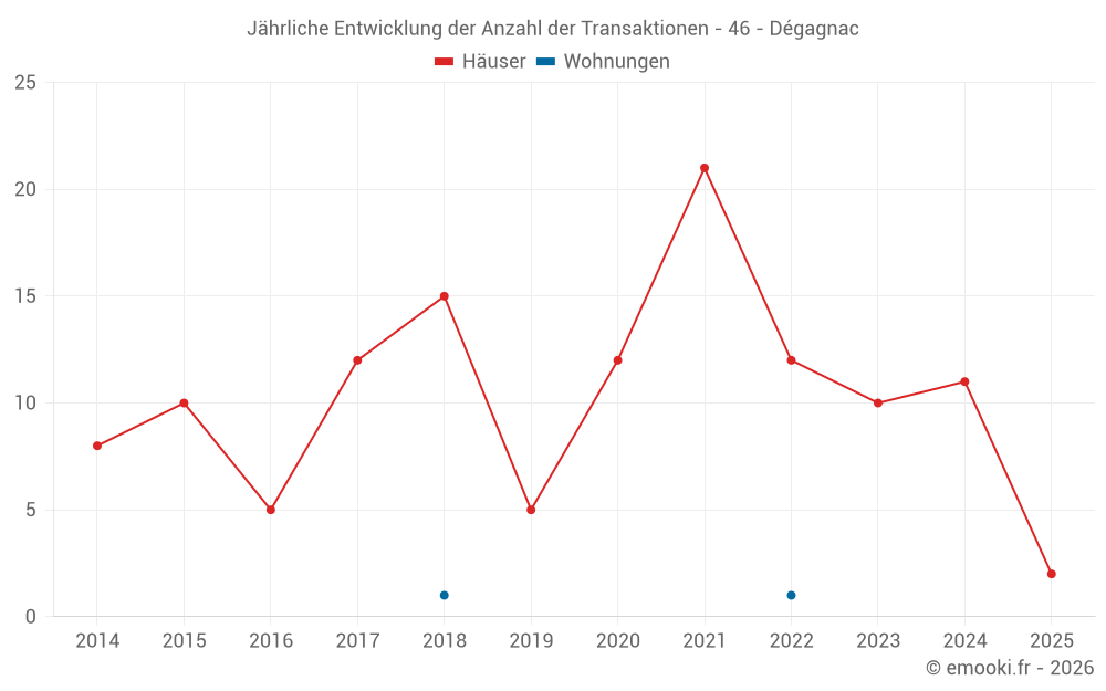 Der Durchschnittspreis auf den 17 Hausgeschäften der letzten 24 Monate in der Gemeinde Dégagnac betrug 1 312 € pro Quadratmeter für einen mittleren Immobilienwert von 159 000 €. Über diesen Zeitraum hinweg lagen 60% der Transaktionen zwischen 942 und 1 800 € pro Quadratmeter (vom 2. bis zum 8. Dezil).