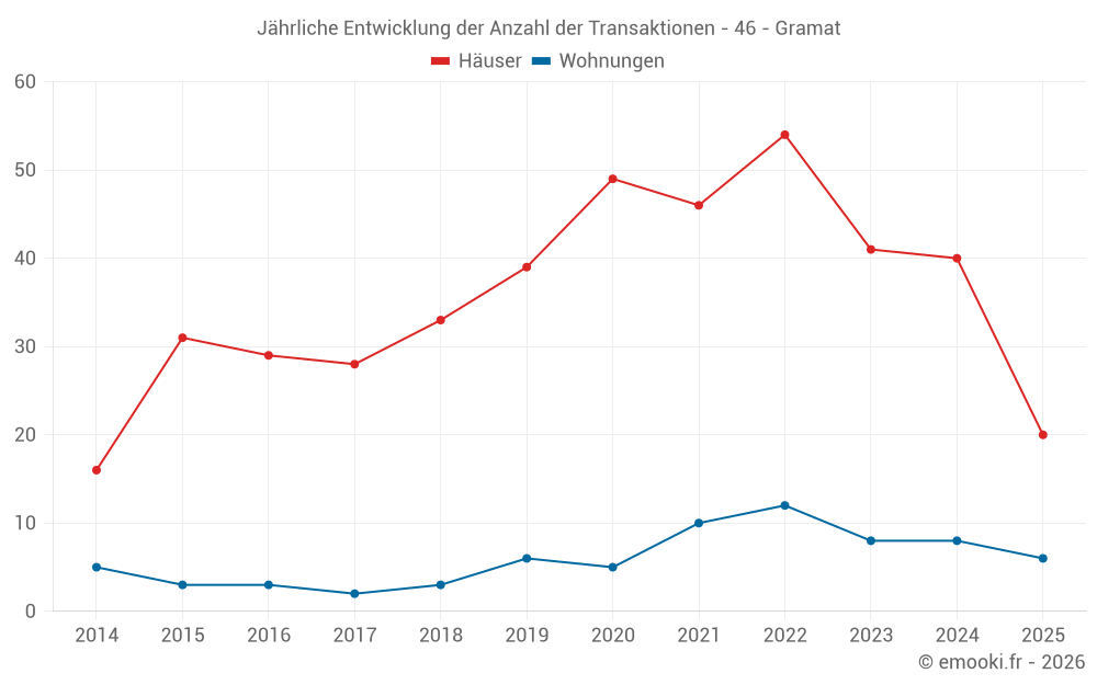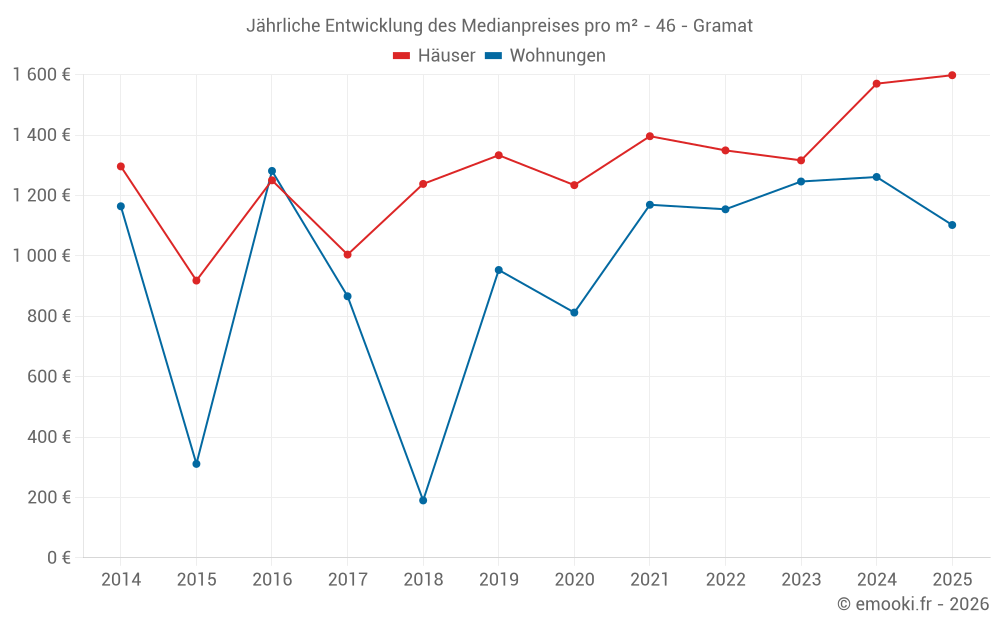 Der Durchschnittspreis auf den 16 Wohnungstransaktionen der letzten 24 Monate in der Gemeinde Gramat betrug 1 192 € pro Quadratmeter für einen mittleren Immobilienwert von 70 000 €. Über diesen Zeitraum hinweg lagen 60% der Transaktionen zwischen 1 050 und 1 420 € pro Quadratmeter (vom 2. bis zum 8. Dezil).
