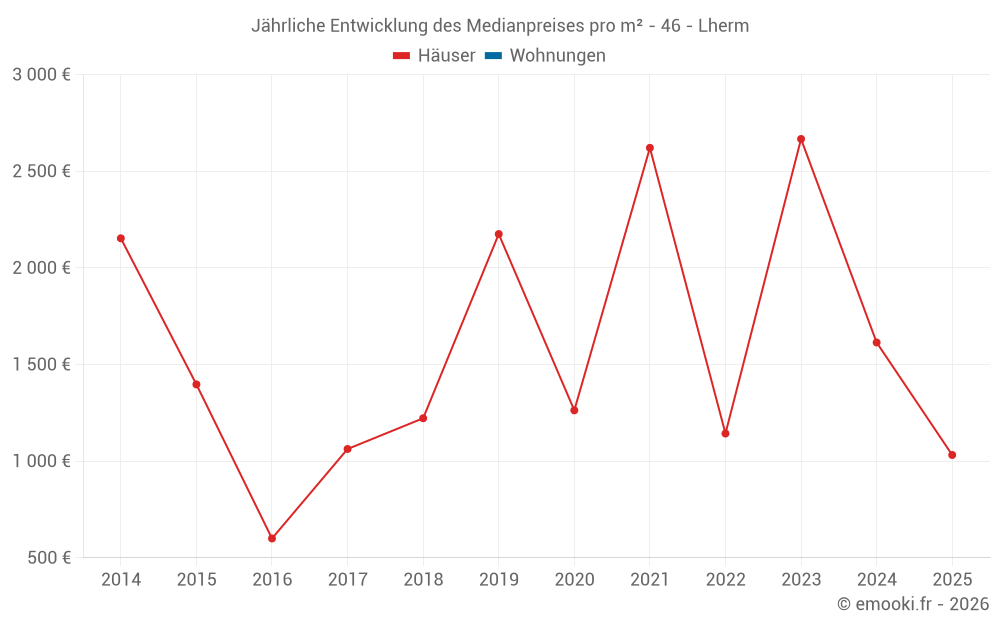 Der Durchschnittspreis auf den 15 Hausgeschäften der letzten 24 Monate in der Gemeinde Lherm betrug 1 714 € pro Quadratmeter für einen mittleren Immobilienwert von 195 000 €. Über diesen Zeitraum hinweg lagen 60% der Transaktionen zwischen 1 026 und 2 210 € pro Quadratmeter (vom 2. bis zum 8. Dezil).