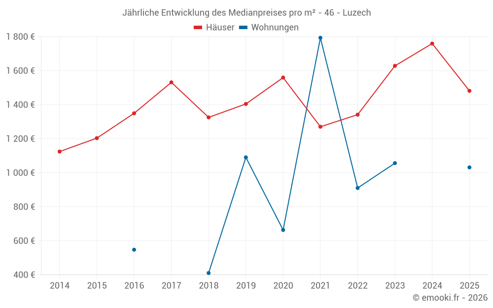 Der Durchschnittspreis auf den 16 Hausgeschäften der letzten 12 Monate in der Gemeinde Luzech betrug 1 671 € pro Quadratmeter für einen mittleren Immobilienwert von 136 000 €. Über diesen Zeitraum hinweg lagen 60% der Transaktionen zwischen 1 228 und 2 130 € pro Quadratmeter (vom 2. bis zum 8. Dezil).