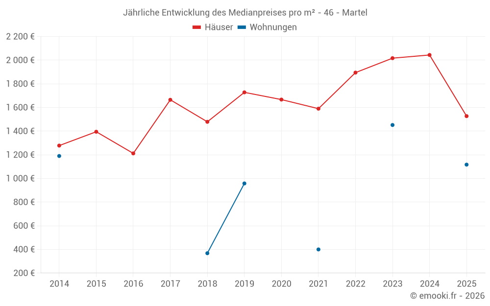 Der Durchschnittspreis auf den 23 Hausgeschäften der letzten 12 Monate in der Gemeinde Martel betrug 1 573 € pro Quadratmeter für einen mittleren Immobilienwert von 187 200 €. Über diesen Zeitraum hinweg lagen 60% der Transaktionen zwischen 1 219 und 2 340 € pro Quadratmeter (vom 2. bis zum 8. Dezil).