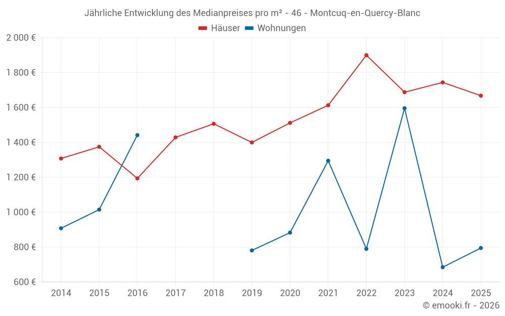 Der Durchschnittspreis auf den 25 Hausgeschäften der letzten 12 Monate in der Gemeinde Montcuq-en-Quercy-Blanc betrug 1 744 € pro Quadratmeter für einen mittleren Immobilienwert von 170 000 €. Über diesen Zeitraum hinweg lagen 60% der Transaktionen zwischen 1 155 und 2 566 € pro Quadratmeter (vom 2. bis zum 8. Dezil).