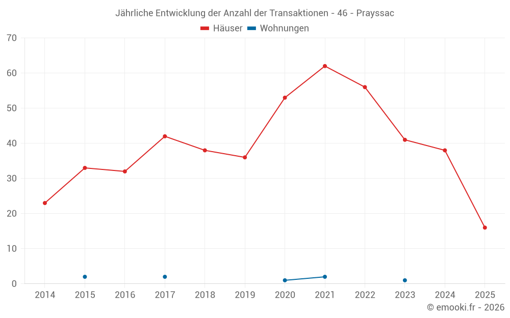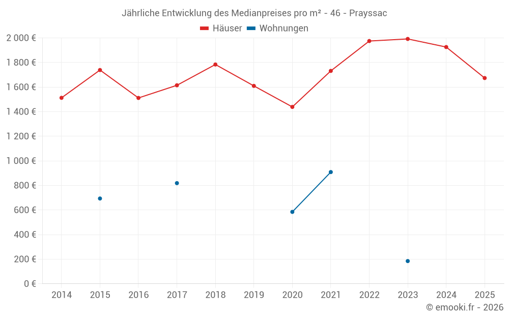 Der Durchschnittspreis auf den 35 Hausgeschäften der letzten 12 Monate in der Gemeinde Prayssac betrug 1 792 € pro Quadratmeter für einen mittleren Immobilienwert von 153 000 €. Über diesen Zeitraum hinweg lagen 60% der Transaktionen zwischen 1 056 und 2 444 € pro Quadratmeter (vom 2. bis zum 8. Dezil).