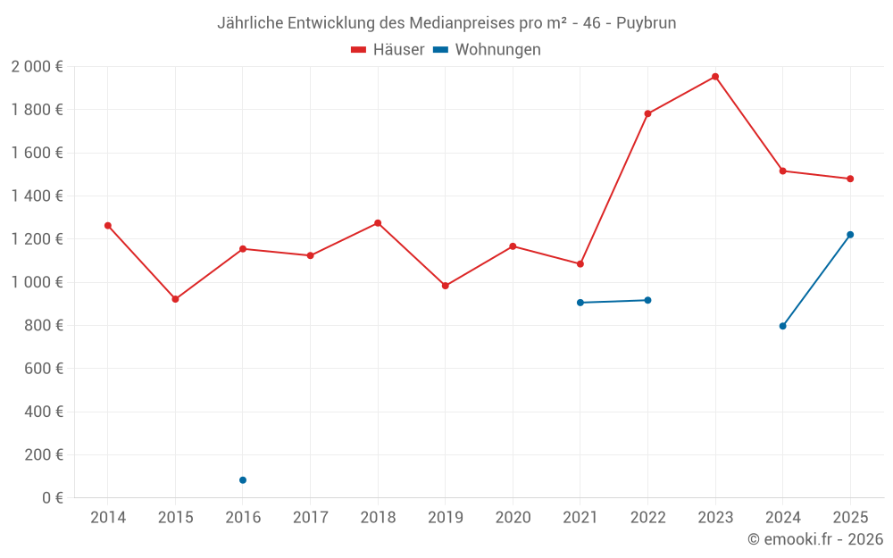 Der Durchschnittspreis auf den 27 Hausgeschäften der letzten 24 Monate in der Gemeinde Puybrun betrug 1 463 € pro Quadratmeter für einen mittleren Immobilienwert von 147 800 €. Über diesen Zeitraum hinweg lagen 60% der Transaktionen zwischen 1 141 und 2 012 € pro Quadratmeter (vom 2. bis zum 8. Dezil).