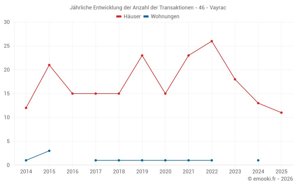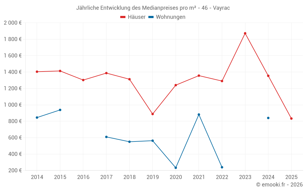 Der Durchschnittspreis auf den 18 Hausgeschäften der letzten 12 Monate in der Gemeinde Vayrac betrug 1 222 € pro Quadratmeter für einen mittleren Immobilienwert von 90 000 €. Über diesen Zeitraum hinweg lagen 60% der Transaktionen zwischen 735 und 1 491 € pro Quadratmeter (vom 2. bis zum 8. Dezil).