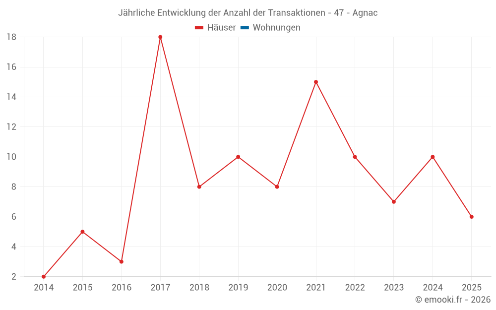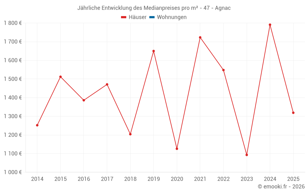 Der Durchschnittspreis auf den 19 Hausgeschäften der letzten 24 Monate in der Gemeinde Agnac betrug 1 596 € pro Quadratmeter für einen mittleren Immobilienwert von 232 500 €. Über diesen Zeitraum hinweg lagen 60% der Transaktionen zwischen 1 068 und 2 087 € pro Quadratmeter (vom 2. bis zum 8. Dezil).