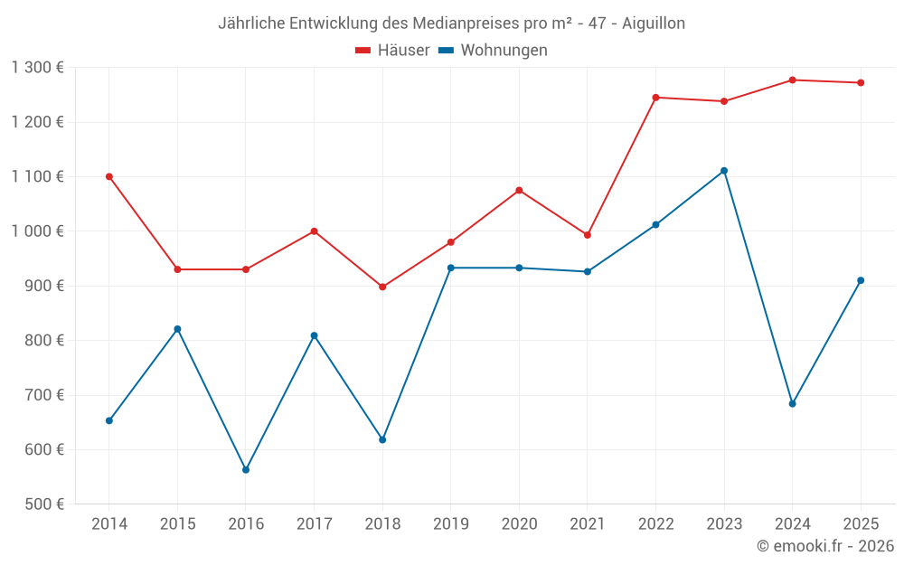 Der Durchschnittspreis auf den 20 Wohnungstransaktionen der letzten 24 Monate in der Gemeinde Aiguillon betrug 958 € pro Quadratmeter für einen mittleren Immobilienwert von 74 000 €. Über diesen Zeitraum hinweg lagen 60% der Transaktionen zwischen 495 und 1 184 € pro Quadratmeter (vom 2. bis zum 8. Dezil).