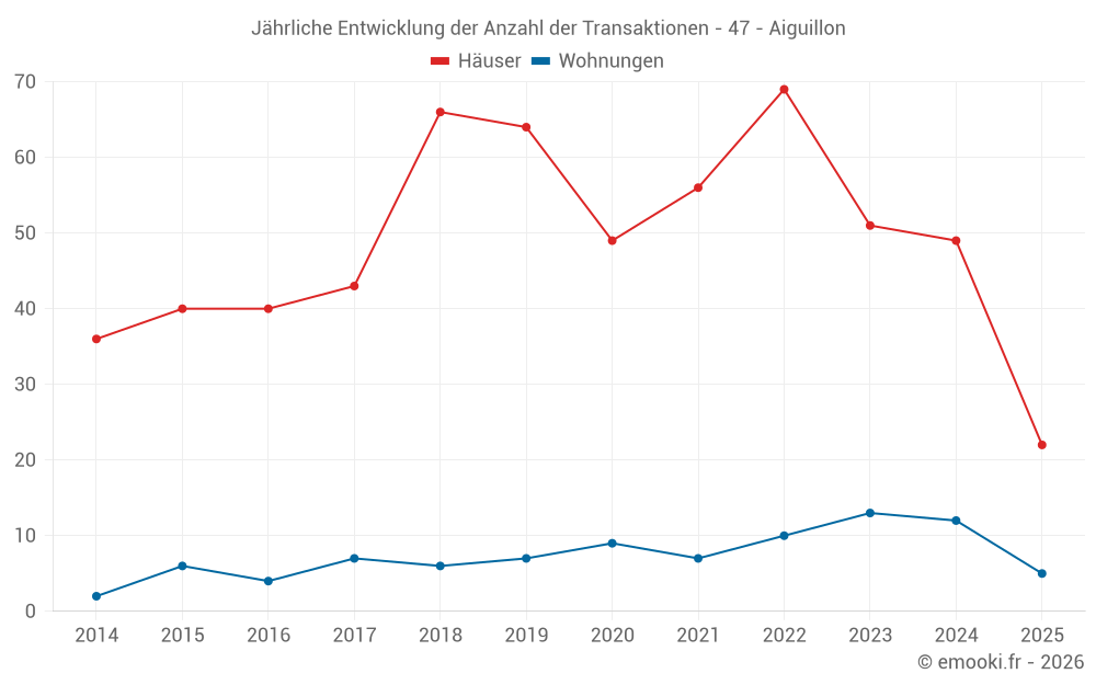 Der Durchschnittspreis auf den 22 Hausgeschäften der letzten 6 Monate in der Gemeinde Aiguillon betrug 1 272 € pro Quadratmeter für einen mittleren Immobilienwert von 107 000 €. Über diesen Zeitraum hinweg lagen 60% der Transaktionen zwischen 875 und 1 797 € pro Quadratmeter (vom 2. bis zum 8. Dezil).