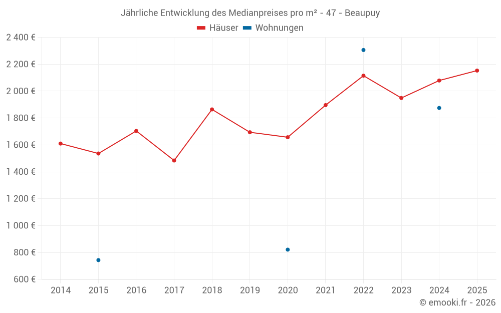 Der Durchschnittspreis auf den 27 Hausgeschäften der letzten 24 Monate in der Gemeinde Beaupuy betrug 2 101 € pro Quadratmeter für einen mittleren Immobilienwert von 225 000 €. Über diesen Zeitraum hinweg lagen 60% der Transaktionen zwischen 1 865 und 2 307 € pro Quadratmeter (vom 2. bis zum 8. Dezil).
