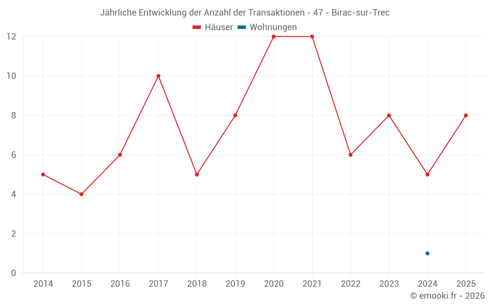 Der Durchschnittspreis auf den 16 Hausgeschäften der letzten 24 Monate in der Gemeinde Birac-sur-Trec betrug 1 240 € pro Quadratmeter für einen mittleren Immobilienwert von 151 925 €. Über diesen Zeitraum hinweg lagen 60% der Transaktionen zwischen 747 und 1 864 € pro Quadratmeter (vom 2. bis zum 8. Dezil).