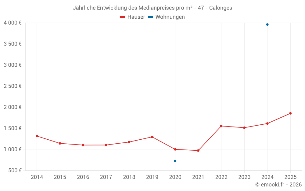 Der Durchschnittspreis auf den 14 Hausgeschäften der letzten 24 Monate in der Gemeinde Calonges betrug 1 606 € pro Quadratmeter für einen mittleren Immobilienwert von 166 695 €. Über diesen Zeitraum hinweg lagen 60% der Transaktionen zwischen 1 360 und 2 248 € pro Quadratmeter (vom 2. bis zum 8. Dezil).