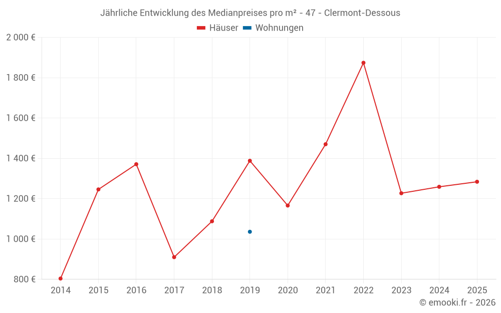 Der Durchschnittspreis auf den 14 Hausgeschäften der letzten 24 Monate in der Gemeinde Clermont-Dessous betrug 1 259 € pro Quadratmeter für einen mittleren Immobilienwert von 157 500 €. Über diesen Zeitraum hinweg lagen 60% der Transaktionen zwischen 821 und 1 642 € pro Quadratmeter (vom 2. bis zum 8. Dezil).