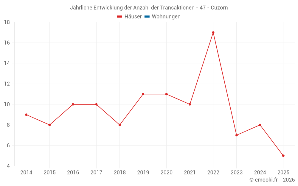 Der Durchschnittspreis auf den 19 Hausgeschäften der letzten 24 Monate in der Gemeinde Cuzorn betrug 1 650 € pro Quadratmeter für einen mittleren Immobilienwert von 153 000 €. Über diesen Zeitraum hinweg lagen 60% der Transaktionen zwischen 1 053 und 2 068 € pro Quadratmeter (vom 2. bis zum 8. Dezil).