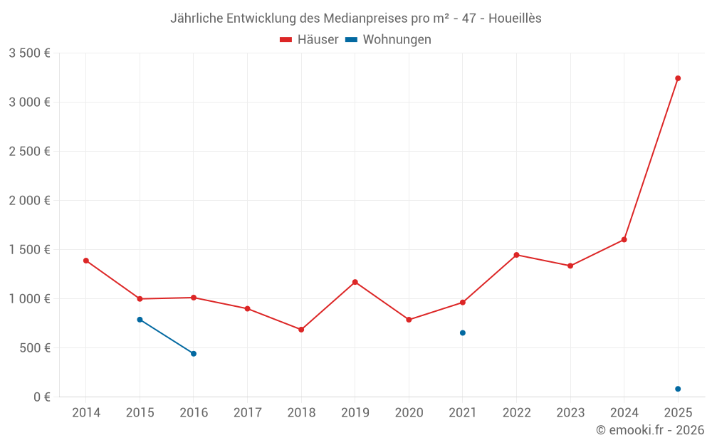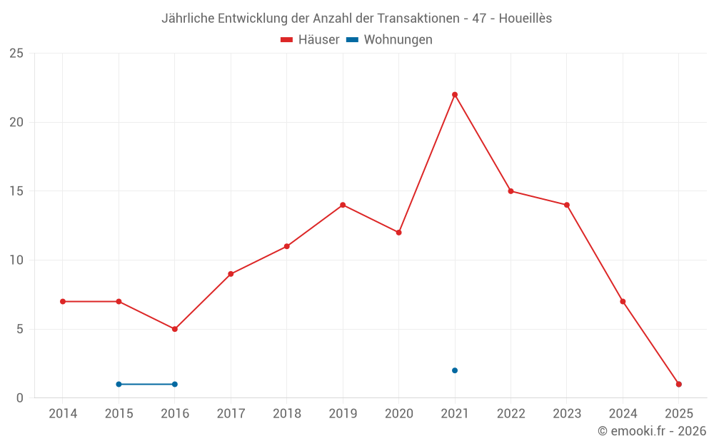 Der Durchschnittspreis auf den 15 Hausgeschäften der letzten 24 Monate in der Gemeinde Houeillès betrug 1 603 € pro Quadratmeter für einen mittleren Immobilienwert von 125 000 €. Über diesen Zeitraum hinweg lagen 60% der Transaktionen zwischen 1 086 und 2 269 € pro Quadratmeter (vom 2. bis zum 8. Dezil).