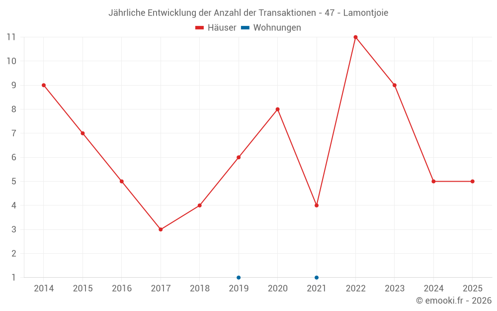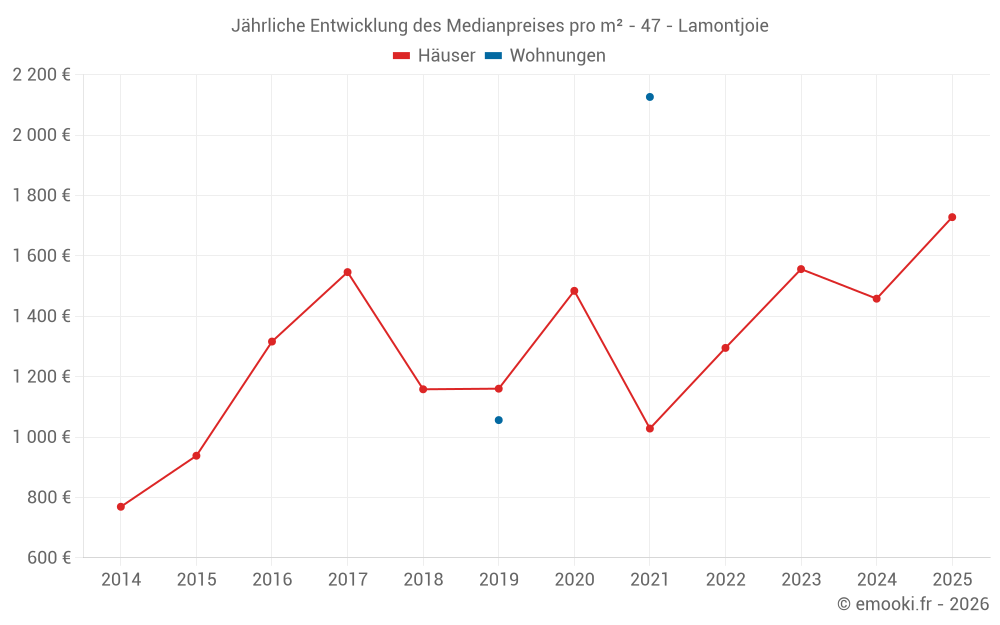 Der Durchschnittspreis auf den 14 Hausgeschäften der letzten 24 Monate in der Gemeinde Lamontjoie betrug 1 507 € pro Quadratmeter für einen mittleren Immobilienwert von 152 500 €. Über diesen Zeitraum hinweg lagen 60% der Transaktionen zwischen 952 und 1 940 € pro Quadratmeter (vom 2. bis zum 8. Dezil).