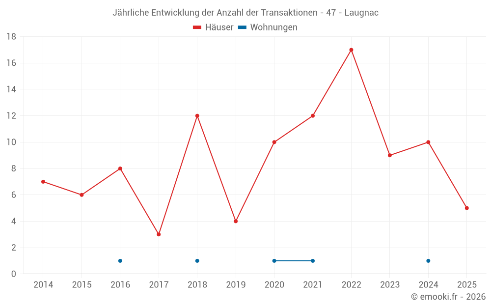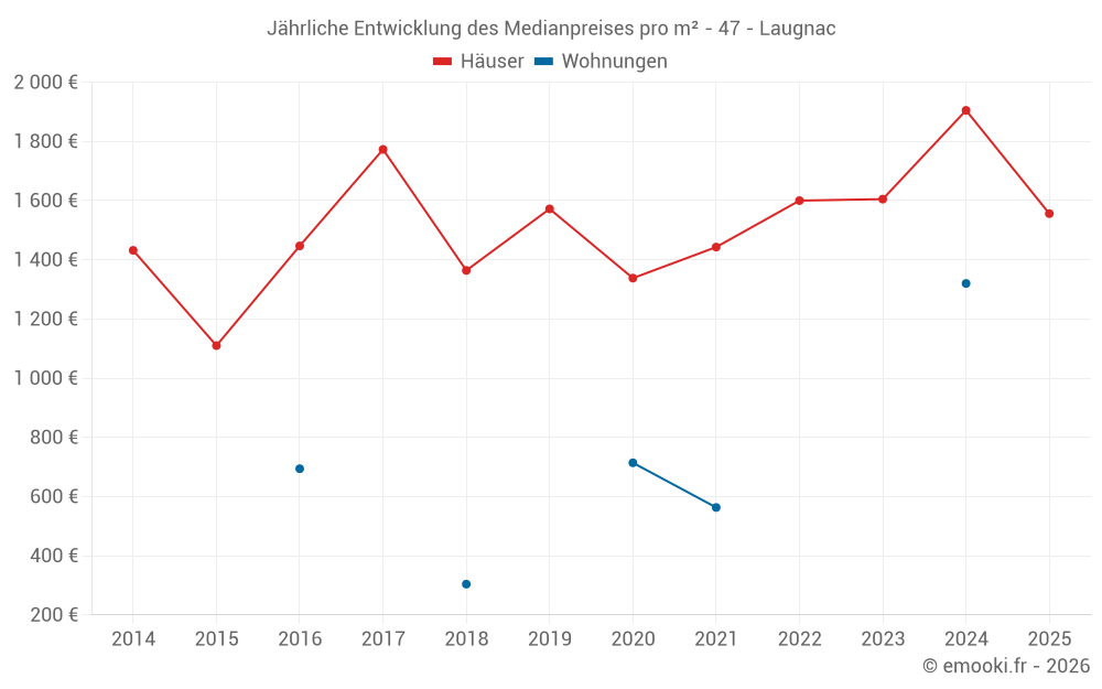 Der Durchschnittspreis auf den 20 Hausgeschäften der letzten 24 Monate in der Gemeinde Laugnac betrug 1 630 € pro Quadratmeter für einen mittleren Immobilienwert von 140 000 €. Über diesen Zeitraum hinweg lagen 60% der Transaktionen zwischen 756 und 2 202 € pro Quadratmeter (vom 2. bis zum 8. Dezil).