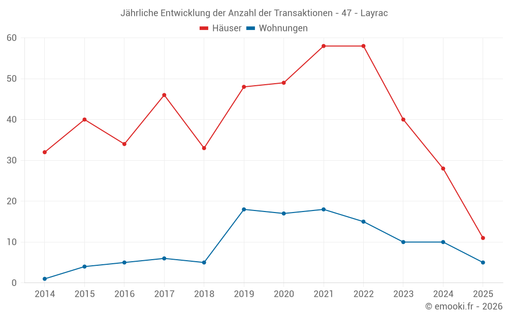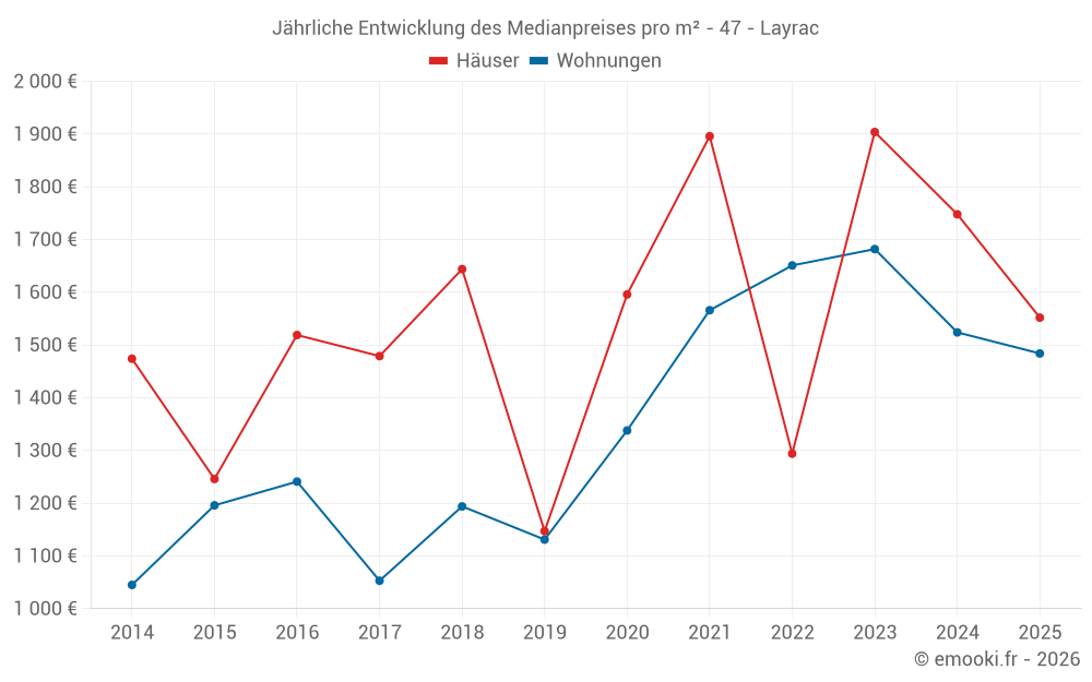 Der Durchschnittspreis auf den 26 Hausgeschäften der letzten 12 Monate in der Gemeinde Layrac betrug 1 755 € pro Quadratmeter für einen mittleren Immobilienwert von 141 750 €. Über diesen Zeitraum hinweg lagen 60% der Transaktionen zwischen 992 und 2 574 € pro Quadratmeter (vom 2. bis zum 8. Dezil).