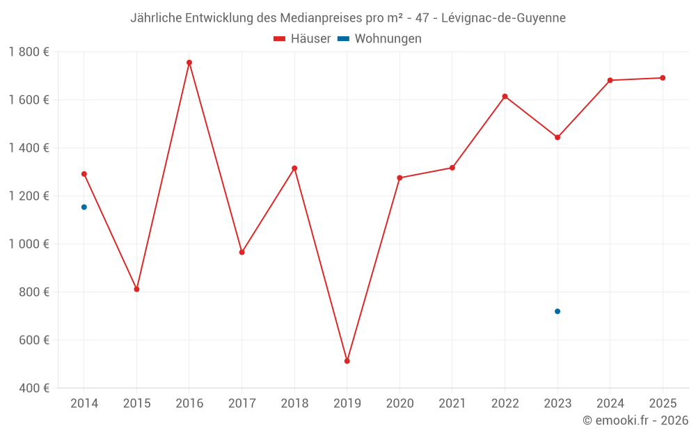 Der Durchschnittspreis auf den 15 Hausgeschäften der letzten 24 Monate in der Gemeinde Lévignac-de-Guyenne betrug 1 742 € pro Quadratmeter für einen mittleren Immobilienwert von 158 505 €. Über diesen Zeitraum hinweg lagen 60% der Transaktionen zwischen 835 und 2 360 € pro Quadratmeter (vom 2. bis zum 8. Dezil).