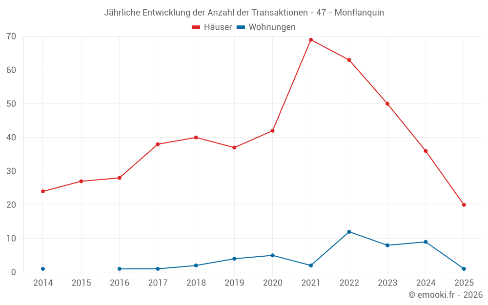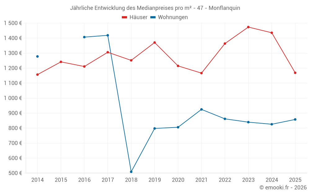 Der Durchschnittspreis auf den 15 Wohnungstransaktionen der letzten 24 Monate in der Gemeinde Monflanquin betrug 839 € pro Quadratmeter für einen mittleren Immobilienwert von 26 600 €. Über diesen Zeitraum hinweg lagen 60% der Transaktionen zwischen 676 und 891 € pro Quadratmeter (vom 2. bis zum 8. Dezil).