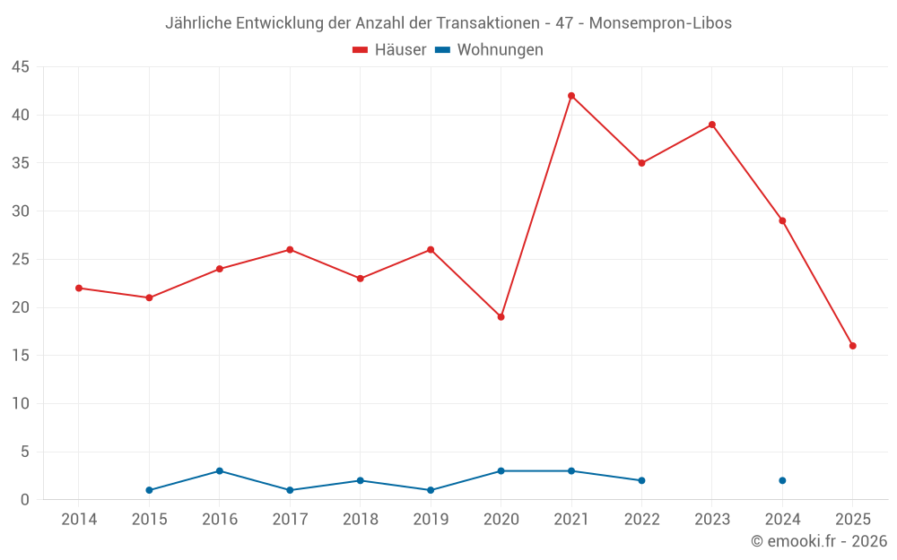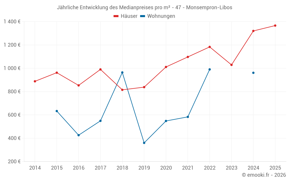 Der Durchschnittspreis auf den 33 Hausgeschäften der letzten 12 Monate in der Gemeinde Monsempron-Libos betrug 1 320 € pro Quadratmeter für einen mittleren Immobilienwert von 107 000 €. Über diesen Zeitraum hinweg lagen 60% der Transaktionen zwischen 941 und 1 883 € pro Quadratmeter (vom 2. bis zum 8. Dezil).