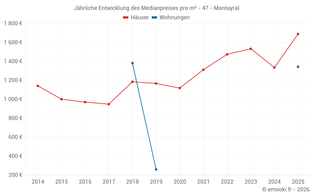 Der Durchschnittspreis auf den 34 Hausgeschäften der letzten 12 Monate in der Gemeinde Montayral betrug 1 526 € pro Quadratmeter für einen mittleren Immobilienwert von 148 950 €. Über diesen Zeitraum hinweg lagen 60% der Transaktionen zwischen 870 und 1 971 € pro Quadratmeter (vom 2. bis zum 8. Dezil).