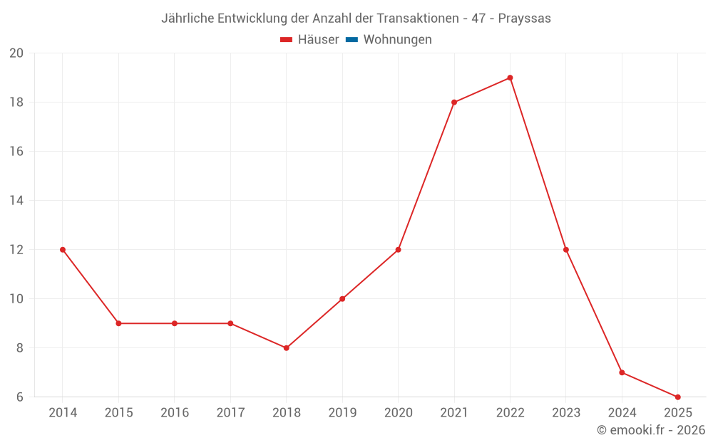 Der Durchschnittspreis auf den 20 Hausgeschäften der letzten 24 Monate in der Gemeinde Prayssas betrug 1 728 € pro Quadratmeter für einen mittleren Immobilienwert von 177 650 €. Über diesen Zeitraum hinweg lagen 60% der Transaktionen zwischen 935 und 2 018 € pro Quadratmeter (vom 2. bis zum 8. Dezil).