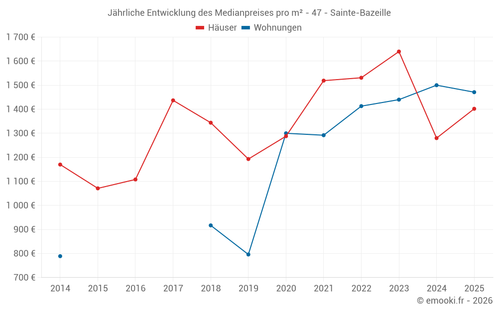Der Durchschnittspreis auf den 32 Hausgeschäften der letzten 12 Monate in der Gemeinde Sainte-Bazeille betrug 1 440 € pro Quadratmeter für einen mittleren Immobilienwert von 138 594 €. Über diesen Zeitraum hinweg lagen 60% der Transaktionen zwischen 910 und 2 027 € pro Quadratmeter (vom 2. bis zum 8. Dezil).