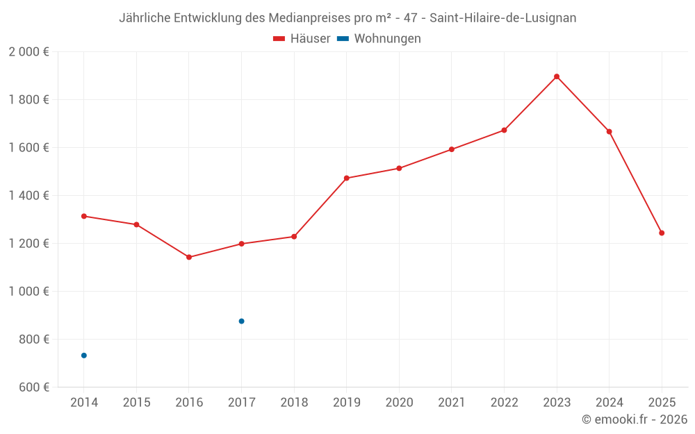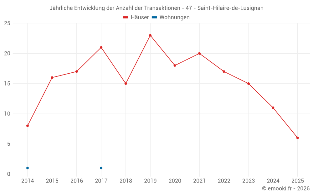 Der Durchschnittspreis auf den 24 Hausgeschäften der letzten 24 Monate in der Gemeinde Saint-Hilaire-de-Lusignan betrug 1 602 € pro Quadratmeter für einen mittleren Immobilienwert von 182 000 €. Über diesen Zeitraum hinweg lagen 60% der Transaktionen zwischen 1 112 und 2 204 € pro Quadratmeter (vom 2. bis zum 8. Dezil).
