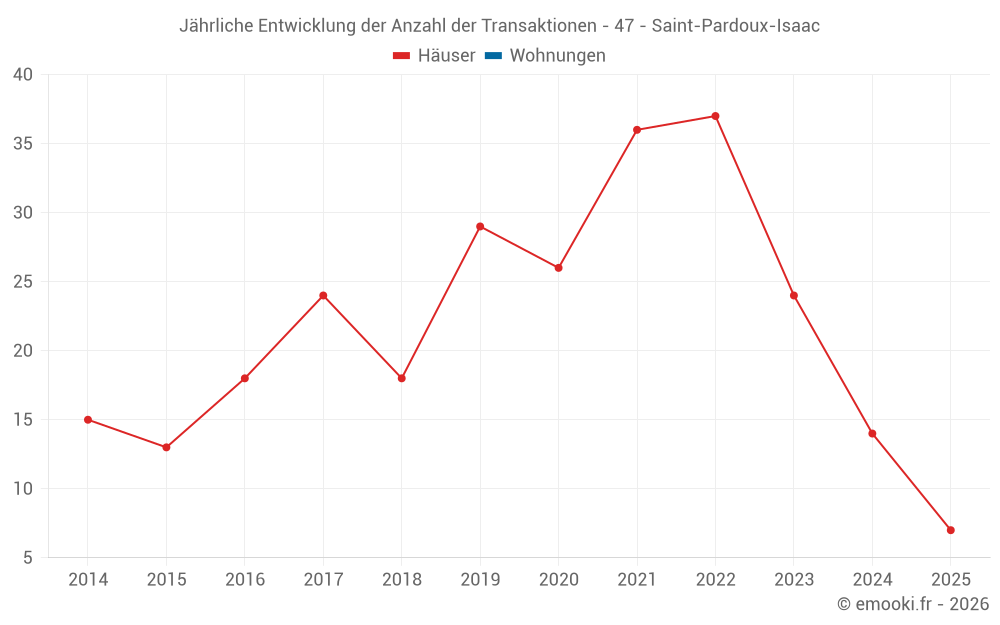 Der Durchschnittspreis auf den 39 Hausgeschäften der letzten 24 Monate in der Gemeinde Saint-Pardoux-Isaac betrug 1 469 € pro Quadratmeter für einen mittleren Immobilienwert von 123 500 €. Über diesen Zeitraum hinweg lagen 60% der Transaktionen zwischen 955 und 2 088 € pro Quadratmeter (vom 2. bis zum 8. Dezil).
