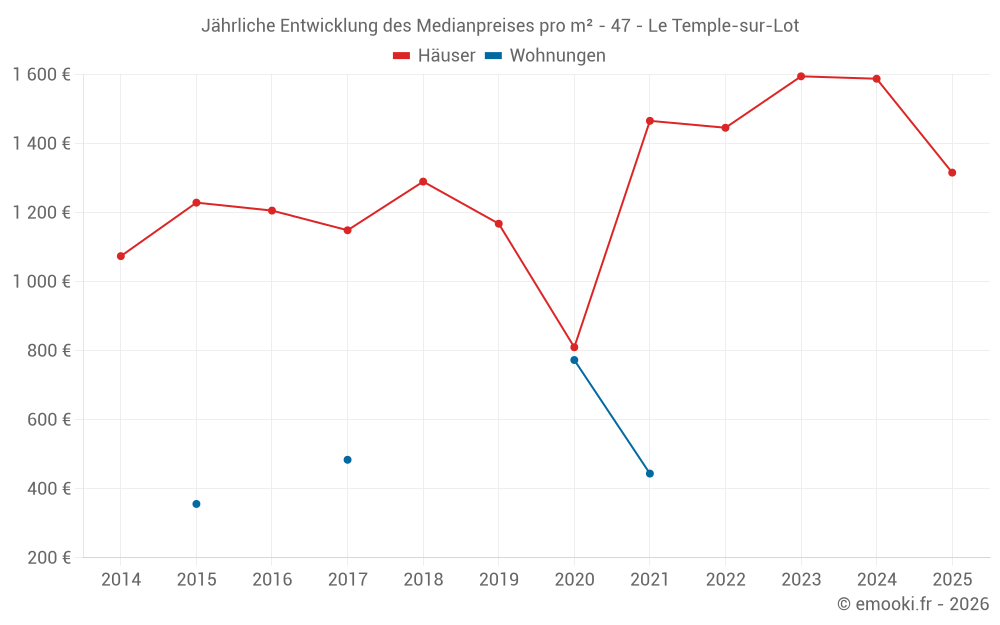 Der Durchschnittspreis auf den 24 Hausgeschäften der letzten 24 Monate in der Gemeinde Le Temple-sur-Lot betrug 1 398 € pro Quadratmeter für einen mittleren Immobilienwert von 159 589 €. Über diesen Zeitraum hinweg lagen 60% der Transaktionen zwischen 974 und 1 848 € pro Quadratmeter (vom 2. bis zum 8. Dezil).