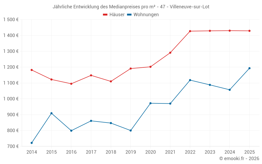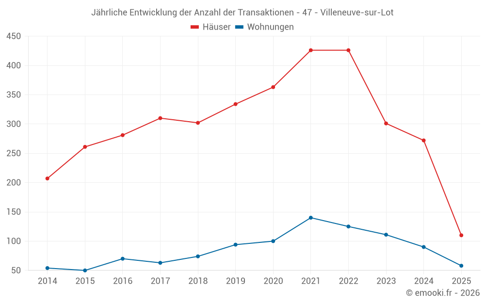 Der Durchschnittspreis auf den 50 Hausgeschäften der letzten 3 Monate in der Gemeinde Villeneuve-sur-Lot betrug 1 196 € pro Quadratmeter für einen mittleren Immobilienwert von 120 000 €. Über diesen Zeitraum hinweg lagen 60% der Transaktionen zwischen 721 und 1 874 € pro Quadratmeter (vom 2. bis zum 8. Dezil).