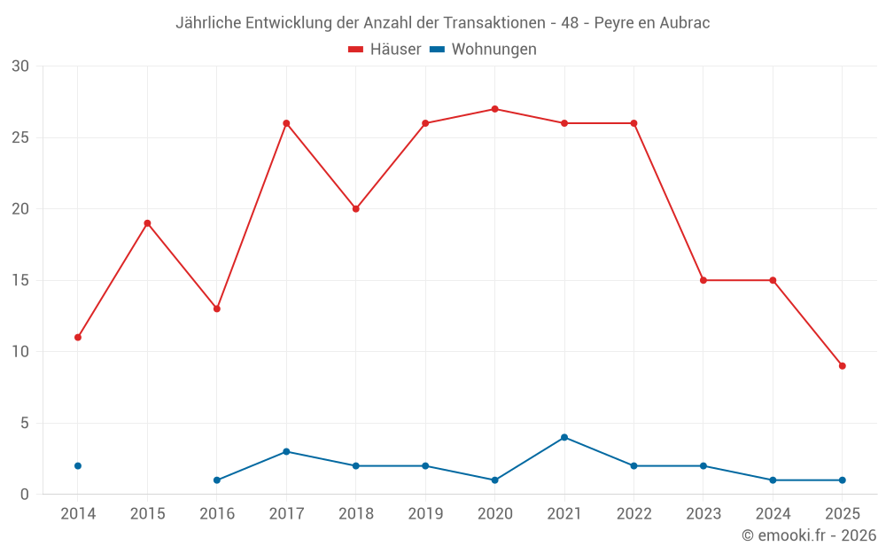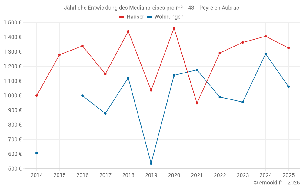 Der Durchschnittspreis auf den 29 Hausgeschäften der letzten 24 Monate in der Gemeinde Peyre en Aubrac betrug 1 406 € pro Quadratmeter für einen mittleren Immobilienwert von 122 000 €. Über diesen Zeitraum hinweg lagen 60% der Transaktionen zwischen 911 und 1 819 € pro Quadratmeter (vom 2. bis zum 8. Dezil).