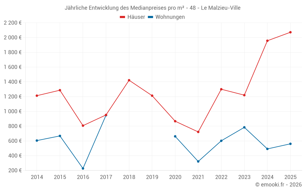 Der Durchschnittspreis auf den 15 Hausgeschäften der letzten 24 Monate in der Gemeinde Le Malzieu-Ville betrug 1 957 € pro Quadratmeter für einen mittleren Immobilienwert von 144 000 €. Über diesen Zeitraum hinweg lagen 60% der Transaktionen zwischen 1 020 und 2 378 € pro Quadratmeter (vom 2. bis zum 8. Dezil).