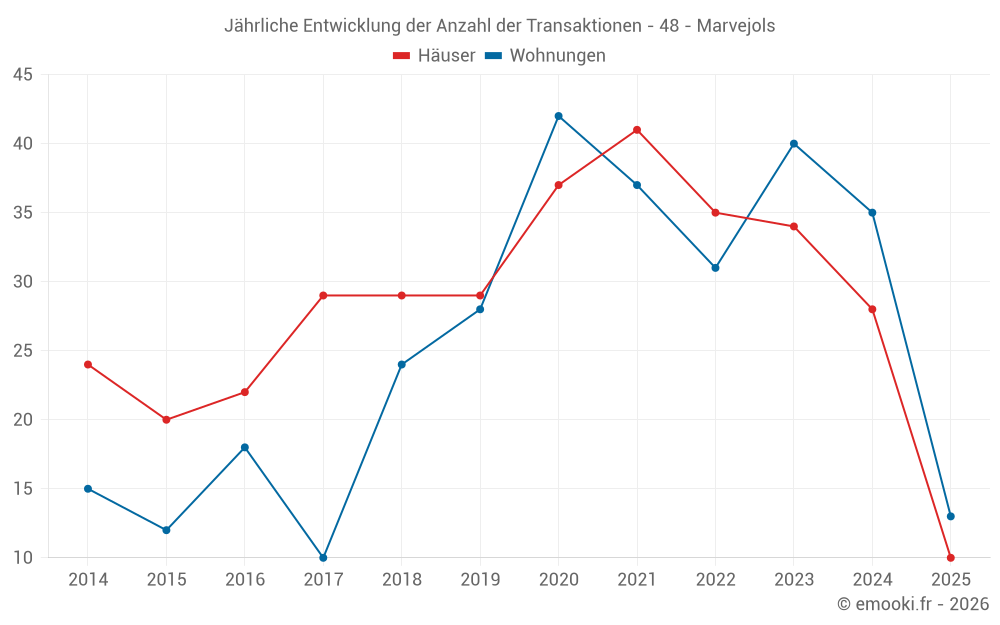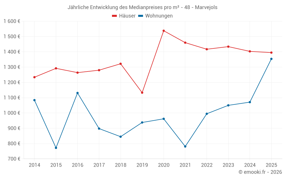Der Durchschnittspreis auf den 29 Hausgeschäften der letzten 12 Monate in der Gemeinde Marvejols betrug 1 473 € pro Quadratmeter für einen mittleren Immobilienwert von 127 000 €. Über diesen Zeitraum hinweg lagen 60% der Transaktionen zwischen 935 und 2 072 € pro Quadratmeter (vom 2. bis zum 8. Dezil).