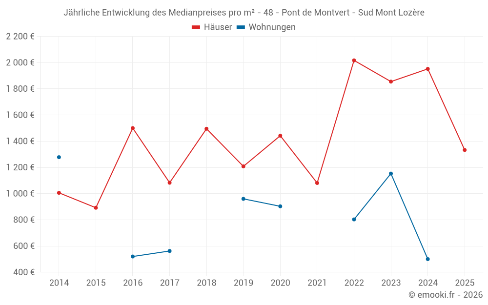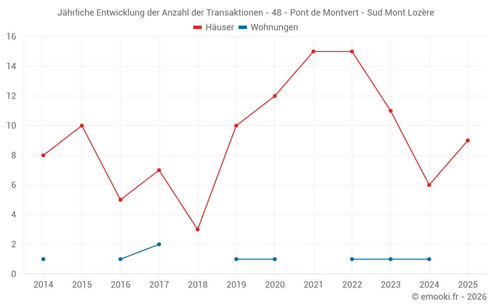 Der Durchschnittspreis auf den 19 Hausgeschäften der letzten 24 Monate in der Gemeinde Pont de Montvert - Sud Mont Lozère betrug 1 855 € pro Quadratmeter für einen mittleren Immobilienwert von 118 000 €. Über diesen Zeitraum hinweg lagen 60% der Transaktionen zwischen 992 und 2 617 € pro Quadratmeter (vom 2. bis zum 8. Dezil).