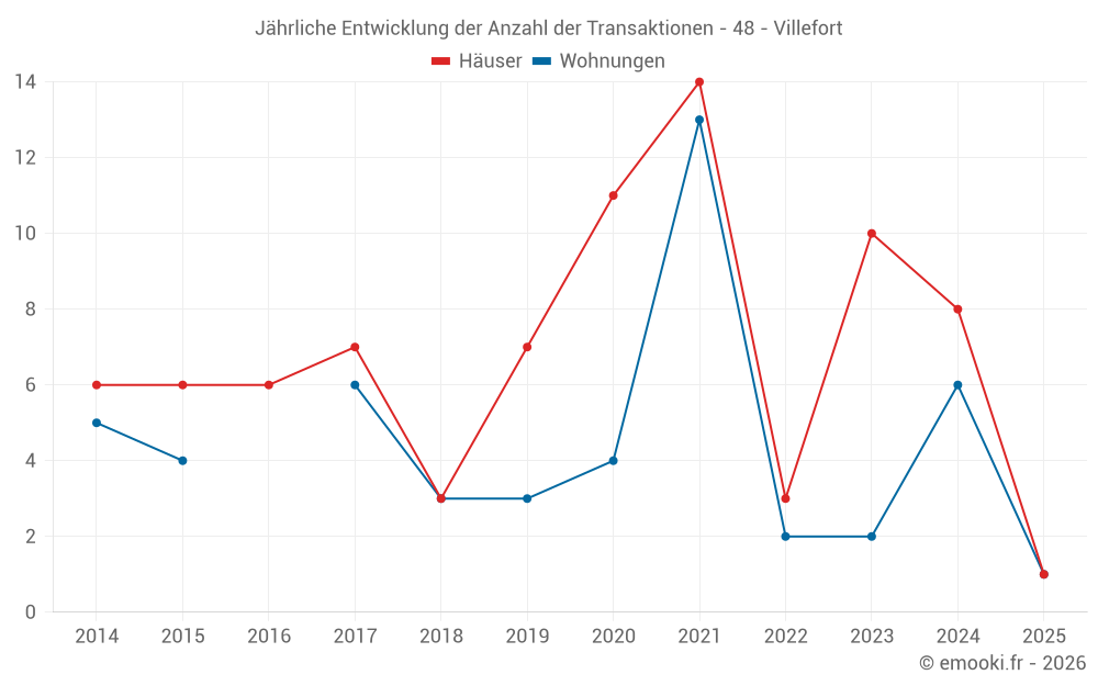Der Durchschnittspreis auf den 15 Hausgeschäften der letzten 24 Monate in der Gemeinde Villefort betrug 1 463 € pro Quadratmeter für einen mittleren Immobilienwert von 78 262 €. Über diesen Zeitraum hinweg lagen 60% der Transaktionen zwischen 613 und 2 104 € pro Quadratmeter (vom 2. bis zum 8. Dezil).