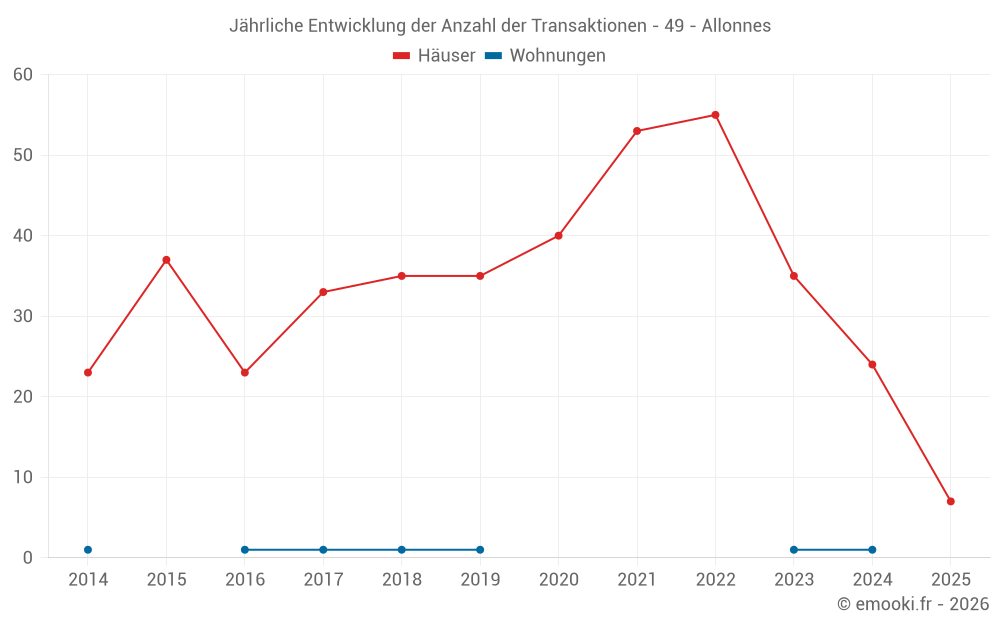 Der Durchschnittspreis auf den 20 Hausgeschäften der letzten 12 Monate in der Gemeinde Allonnes betrug 1 606 € pro Quadratmeter für einen mittleren Immobilienwert von 142 500 €. Über diesen Zeitraum hinweg lagen 60% der Transaktionen zwischen 1 197 und 1 841 € pro Quadratmeter (vom 2. bis zum 8. Dezil).