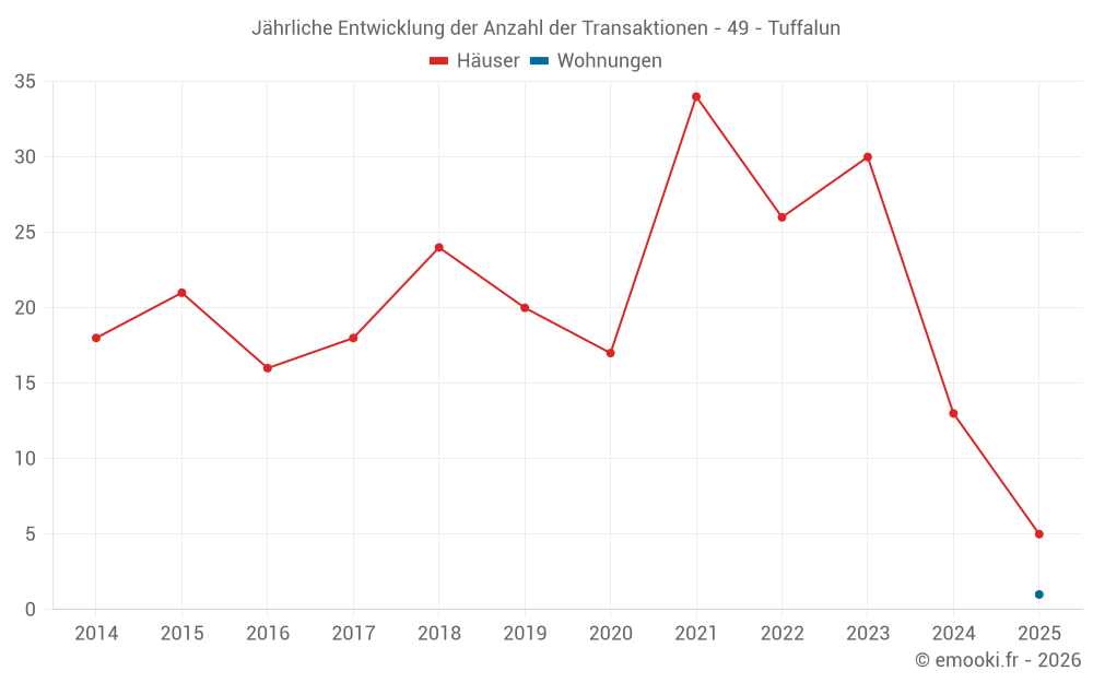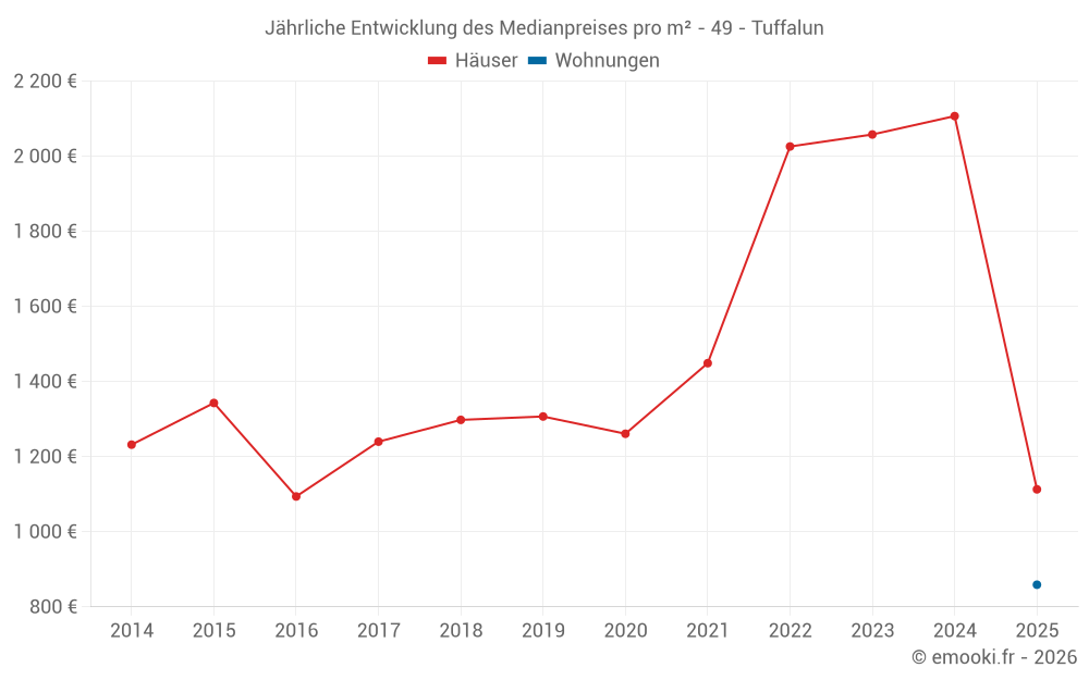 Der Durchschnittspreis auf den 36 Hausgeschäften der letzten 24 Monate in der Gemeinde Tuffalun betrug 2 044 € pro Quadratmeter für einen mittleren Immobilienwert von 214 500 €. Über diesen Zeitraum hinweg lagen 60% der Transaktionen zwischen 1 113 und 2 479 € pro Quadratmeter (vom 2. bis zum 8. Dezil).