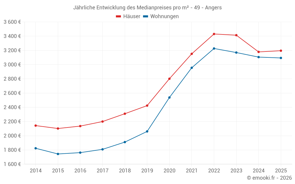 Der Durchschnittspreis auf den 157 Wohnungstransaktionen der letzten 3 Monate in der Gemeinde Angers betrug 3 200 € pro Quadratmeter für einen mittleren Immobilienwert von 150 000 €. Über diesen Zeitraum hinweg lagen 60% der Transaktionen zwischen 2 310 und 4 138 € pro Quadratmeter (vom 2. bis zum 8. Dezil).