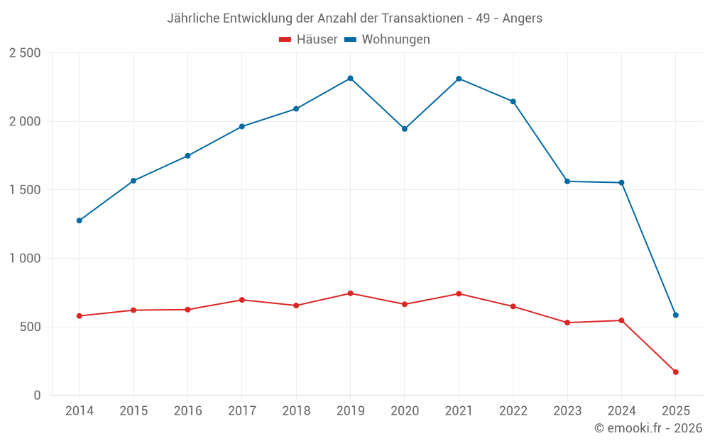 Der Durchschnittspreis auf den 43 Hausgeschäften der letzten 3 Monate in der Gemeinde Angers betrug 3 368 € pro Quadratmeter für einen mittleren Immobilienwert von 375 000 €. Über diesen Zeitraum hinweg lagen 60% der Transaktionen zwischen 2 539 und 4 007 € pro Quadratmeter (vom 2. bis zum 8. Dezil).