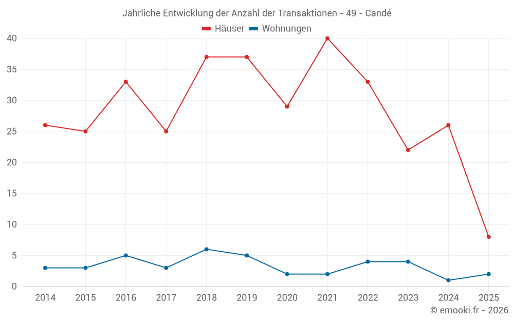 Der Durchschnittspreis auf den 22 Hausgeschäften der letzten 12 Monate in der Gemeinde Candé betrug 1 700 € pro Quadratmeter für einen mittleren Immobilienwert von 156 250 €. Über diesen Zeitraum hinweg lagen 60% der Transaktionen zwischen 1 158 und 1 994 € pro Quadratmeter (vom 2. bis zum 8. Dezil).