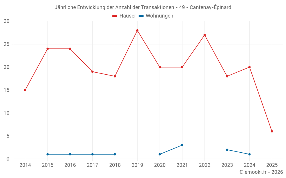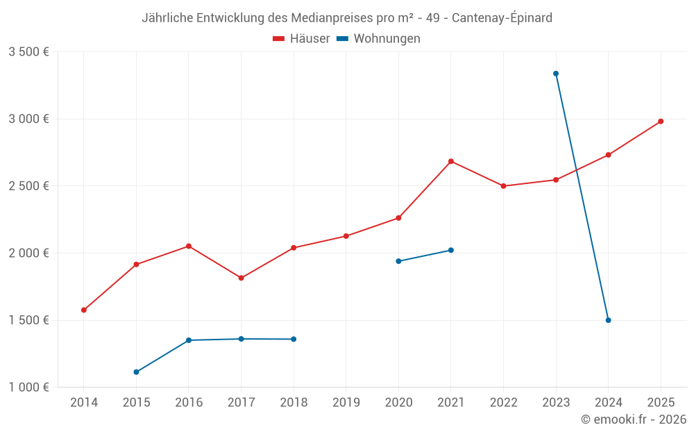 Der Durchschnittspreis auf den 22 Hausgeschäften der letzten 12 Monate in der Gemeinde Cantenay-Épinard betrug 2 724 € pro Quadratmeter für einen mittleren Immobilienwert von 312 500 €. Über diesen Zeitraum hinweg lagen 60% der Transaktionen zwischen 2 240 und 3 274 € pro Quadratmeter (vom 2. bis zum 8. Dezil).