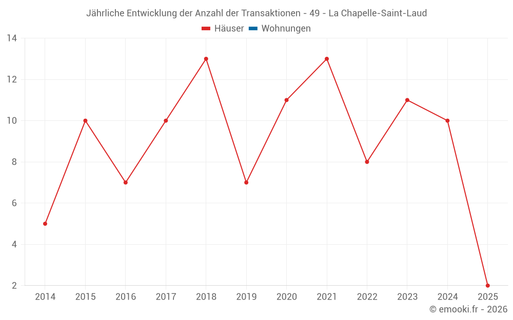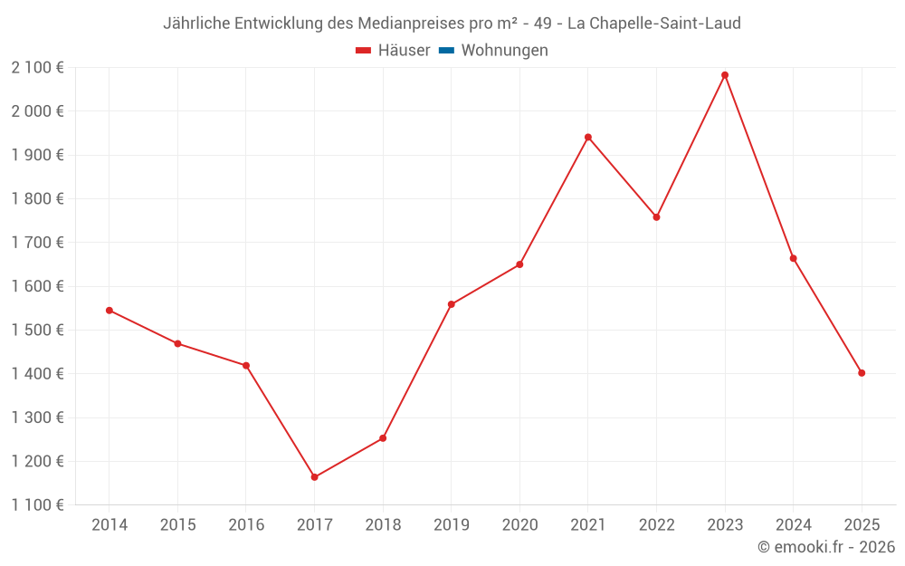 Der Durchschnittspreis auf den 17 Hausgeschäften der letzten 24 Monate in der Gemeinde La Chapelle-Saint-Laud betrug 1 760 € pro Quadratmeter für einen mittleren Immobilienwert von 176 000 €. Über diesen Zeitraum hinweg lagen 60% der Transaktionen zwischen 1 353 und 2 403 € pro Quadratmeter (vom 2. bis zum 8. Dezil).