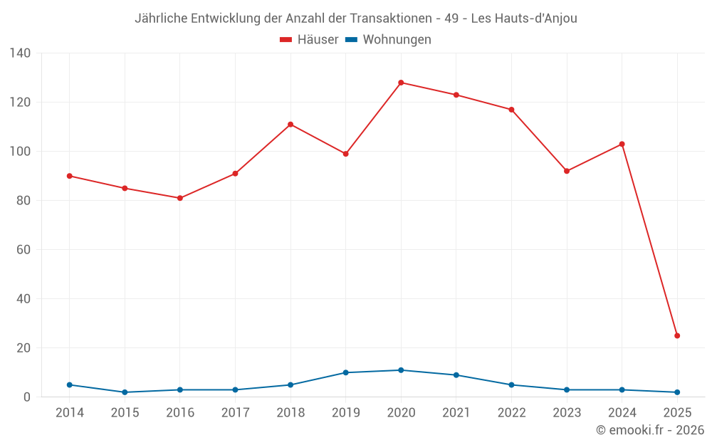 Der Durchschnittspreis auf den 25 Hausgeschäften der letzten 6 Monate in der Gemeinde Les Hauts-d'Anjou betrug 1 593 € pro Quadratmeter für einen mittleren Immobilienwert von 180 000 €. Über diesen Zeitraum hinweg lagen 60% der Transaktionen zwischen 968 und 2 168 € pro Quadratmeter (vom 2. bis zum 8. Dezil).