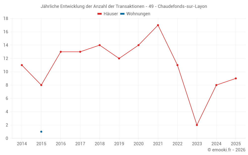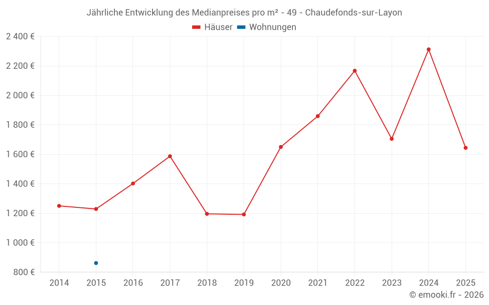 Der Durchschnittspreis auf den 17 Hausgeschäften der letzten 24 Monate in der Gemeinde Chaudefonds-sur-Layon betrug 2 076 € pro Quadratmeter für einen mittleren Immobilienwert von 158 000 €. Über diesen Zeitraum hinweg lagen 60% der Transaktionen zwischen 1 249 und 2 335 € pro Quadratmeter (vom 2. bis zum 8. Dezil).