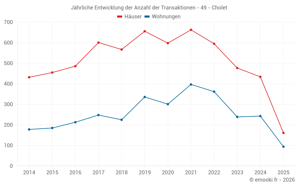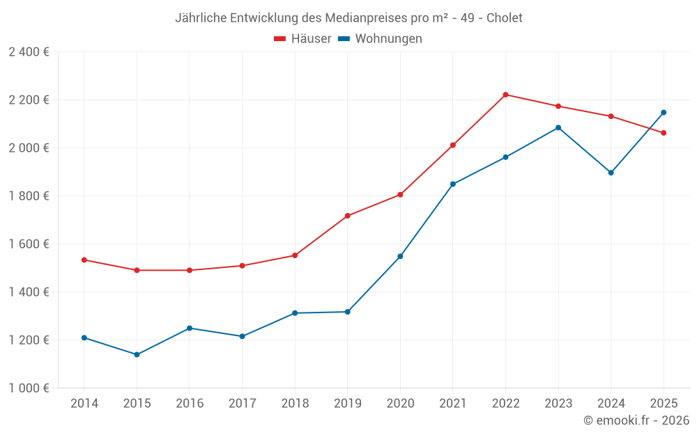 Der Durchschnittspreis auf den 55 Hausgeschäften der letzten 3 Monate in der Gemeinde Cholet betrug 2 062 € pro Quadratmeter für einen mittleren Immobilienwert von 170 000 €. Über diesen Zeitraum hinweg lagen 60% der Transaktionen zwischen 1 621 und 2 551 € pro Quadratmeter (vom 2. bis zum 8. Dezil).